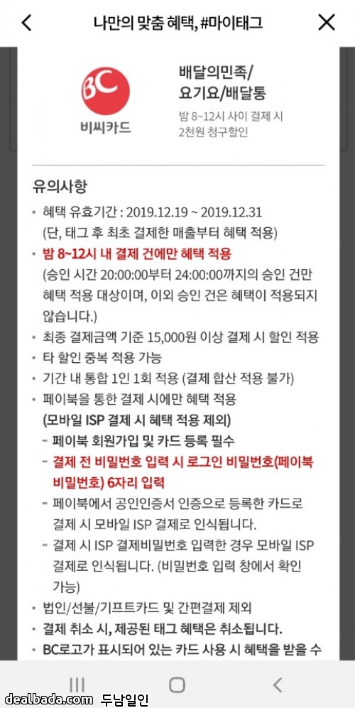 비씨카드 마이태그 배민, 요기요, 배달통 밤 8시~12시 2천원 청구 할인 됩니다.