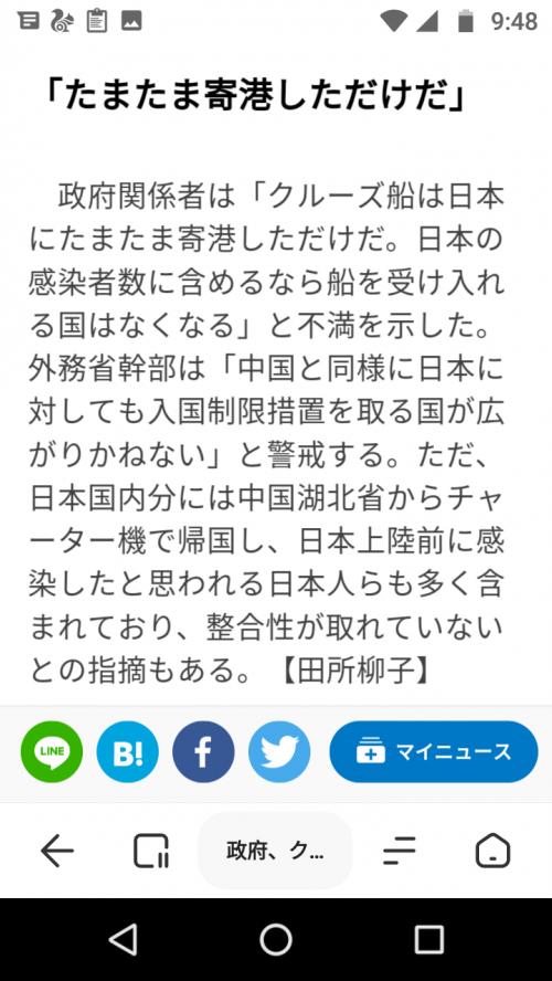 정부 관계자는 크루즈선은 일본에 우연히 들렀을 뿐이다. 일본의 감염자수에 포함시킨다면 배를 받아 들이는 나라는 없어진다"고 불만을 나타냈다.