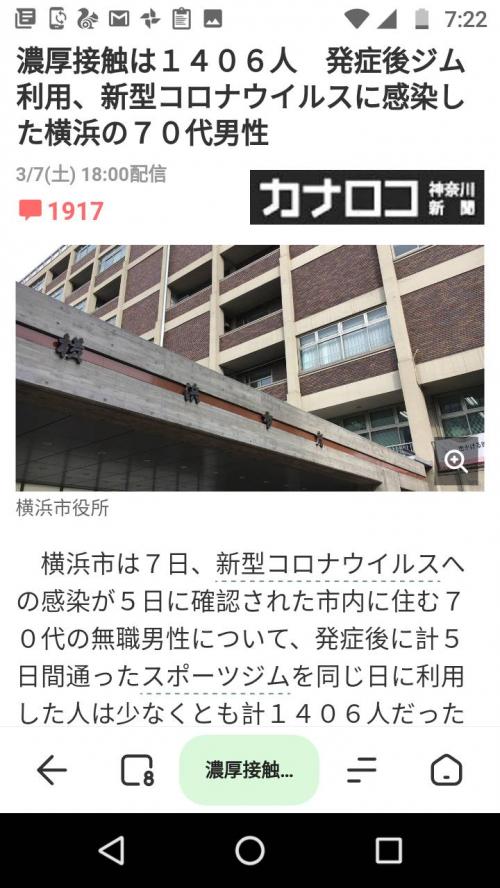 시에 의하면, 남성은 발병 후, 2월 25~27일, 29일, 3월 1일에 코호쿠구의 상업 시설 "트레사 요코하마 TRESSA YOKOHAMA" 내의 스포츠클럽 "센트럴 웰니스 클럽 트레사(오쿠라야마)"를 이용했다.