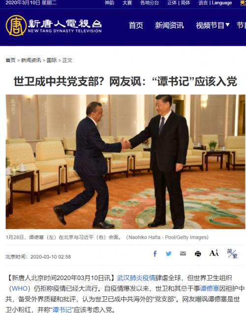 WHO는 중국 공산당 지부(支部)? 네티즌은 WHO 사무총장이 공산당 서기라고 비꼬았다.