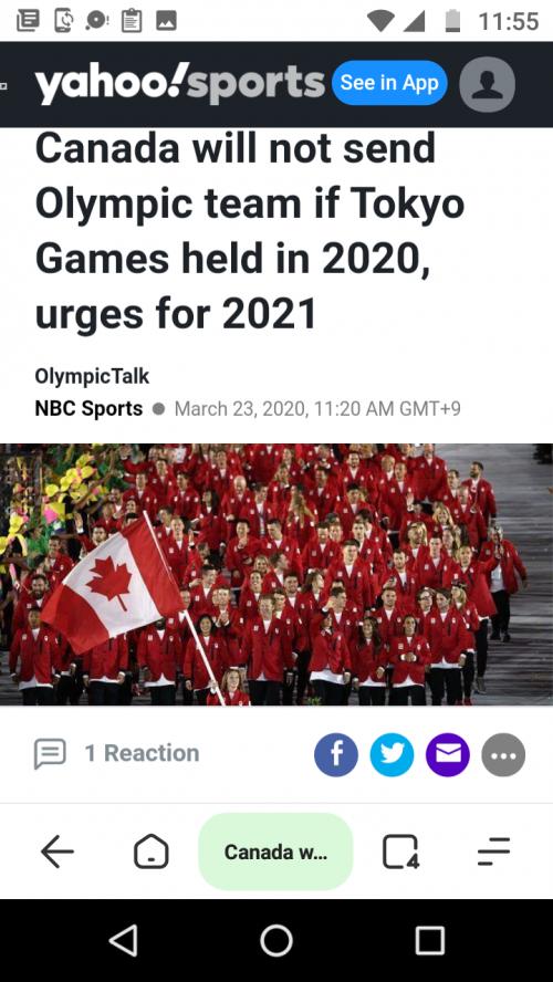 캐나다 올림픽 위원회는 2020년에 개최될 경우 도쿄 올림픽에 팀을 보내지 않을 것이다. COC는 코로나바이러스 위험성을 들어 "1년 연기"를 요청했다.