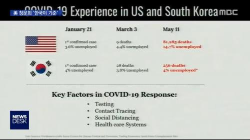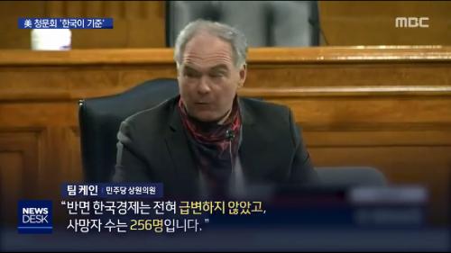 [팀 케인 상원의원/민주당] "미국인 8만 1천명이 숨졌고, 미국 경제는 대공황 이후 본 적이 없는 실직 사태를 겪었습니다. 반면 한국경제는 전혀 급변하지 않았고, 사망자수는 256명입니다."