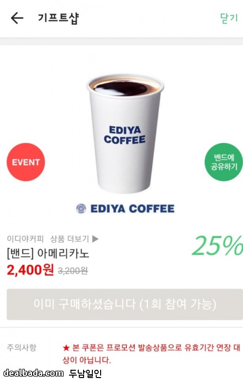 밴드샵에서 이디야 아메리카노 25% 행사합니다.