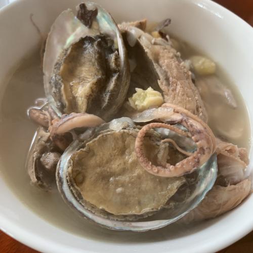 전복낙지삼계탕에, 삼겹살 구이입니다 밭에서 직접 기른 생미나리와 풋고추까지