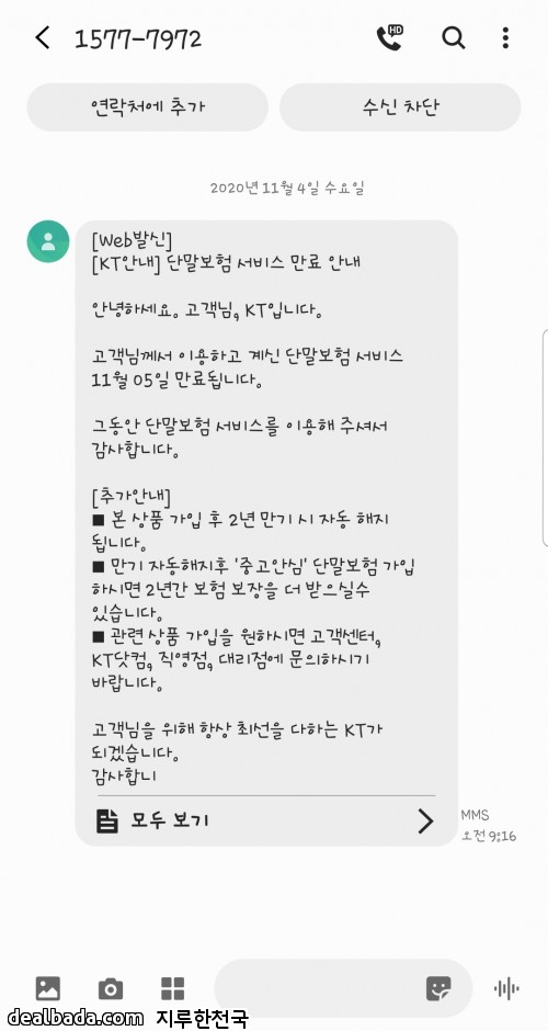 제가 핸드폰보험이 내일 끝난다고 문자가왔어요