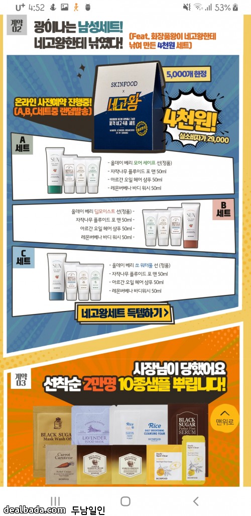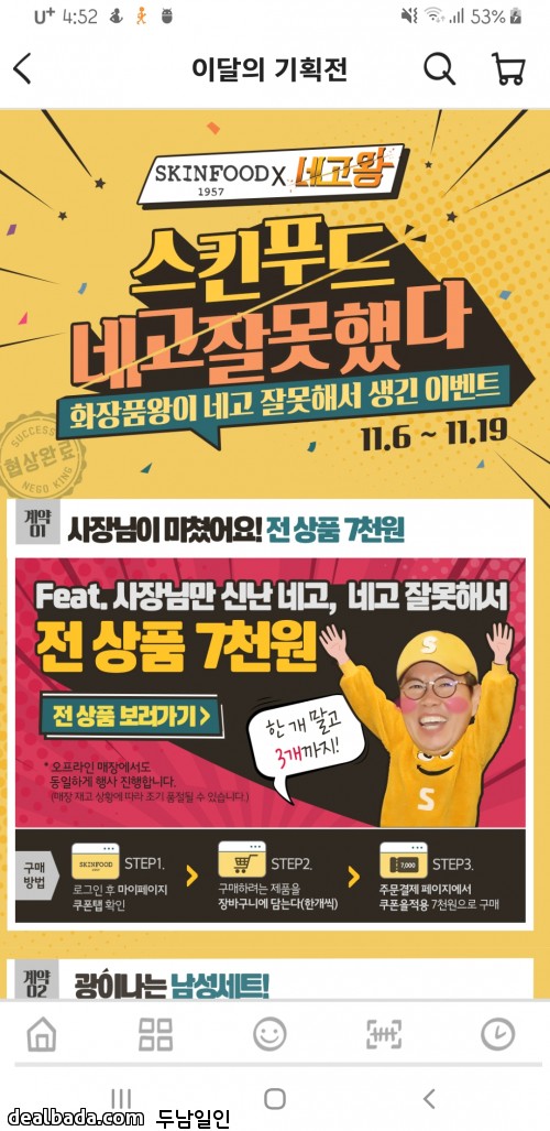 회원에 한해 스킨푸드 전제품을 7,000원에 쿠폰 3장을 발행해주네요. 다른 이벤트도 있는데 선착순이라ㅠㅠ