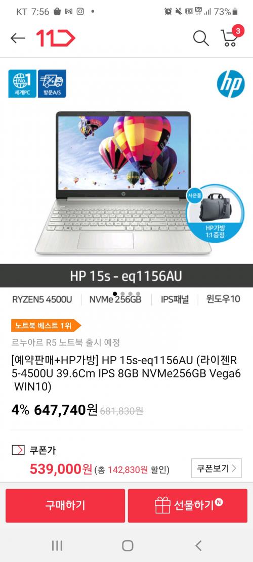 HP에 윈도우 포함인데 54만원이면 훌륭합니다.^^ | ||