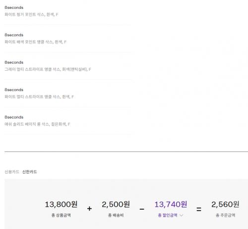 에잇세컨즈 양말 6켤레 샀는데 자체할인이랑 적립금 이용해서 배송비만 내고 구매했습니다.