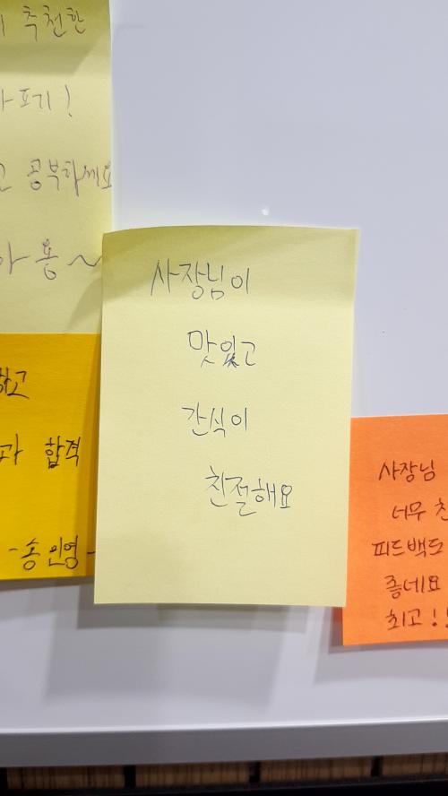 간식이 맛있고 사장님이 친절해요라고 썼어야 할 거 같은데 ㅎㅎ 급하게 썼나보네요;ㅋㅋ | ||