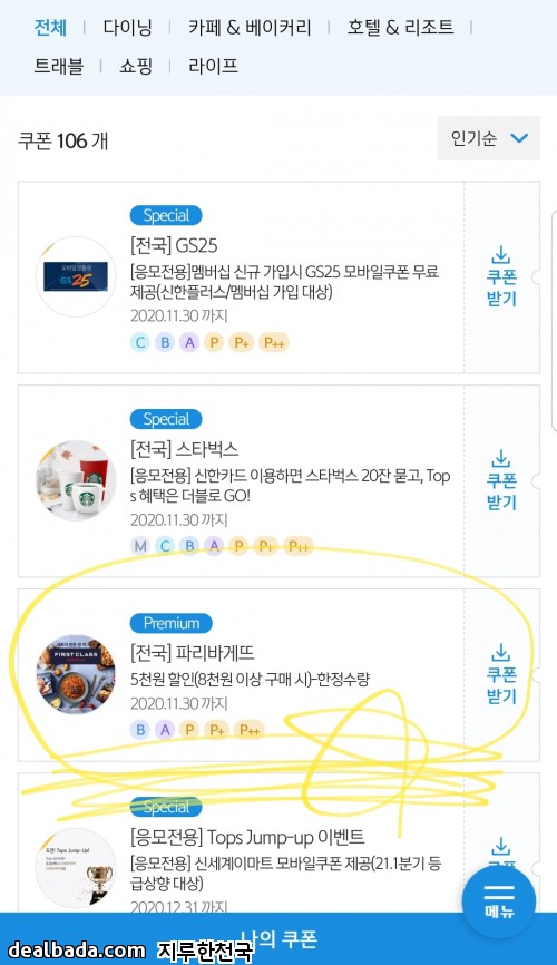 현재 신한탑스에서 파바쿠폰 받을수있어요