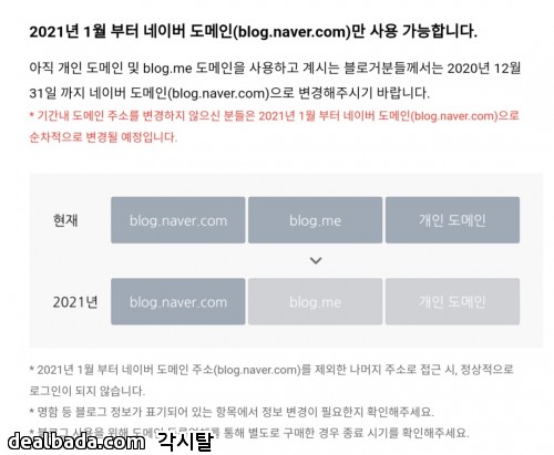 개인 도메인이면 별도의 서버를 구축해서 redirect 시키는 식으로 우회라도 가능하지만, blog.me 도메인을 쓰던 사람들은 한마디로 망했어요. 2021년 1월 1일부터 blog.me 주소로는 아예 접근이 안 될 예정이니 blog.me 도메인을 박아둔 전단지나 명함, 출판물 등은 한 순간에 쓰레기가 되는 것이다...."