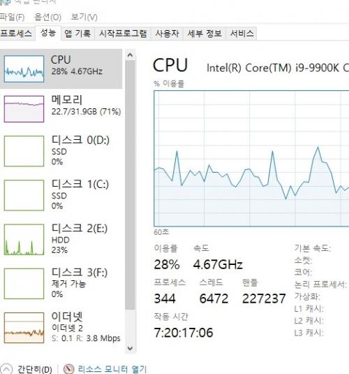 메모리 많이 꽂아두면 하는대로 여유롭게 더 먹는 것 같기도 해요ㅎㅎ 저도 32 이상으로 넘어갔는데 하던거 안 끄고 최소화하면서 쓰는데 성능 저하가 크게 안 느껴지니 컴퓨터도 안 끄고 절전모드로 두는 습관이 들어버렸습니다. | ||