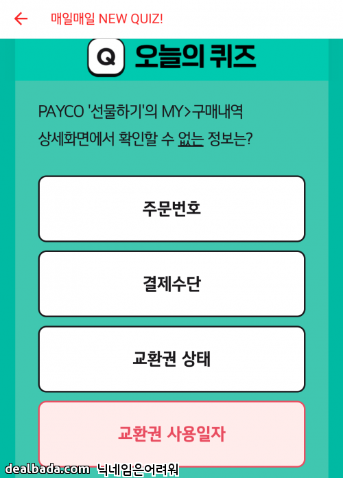 오늘의 페이코 뉴퀴즈 정답은 4번 교환권 사용일자 입니다.
