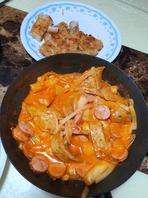 점심 뭐줄까 하다가 돈가스랑 로제떡볶이 했네요..