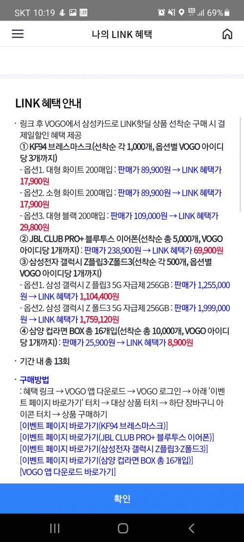 VOGO앱에서 JBL 블투 이어폰을 판매중인데 삼성카드 LINK 혜택추가하면 69,900원이 됩니다..