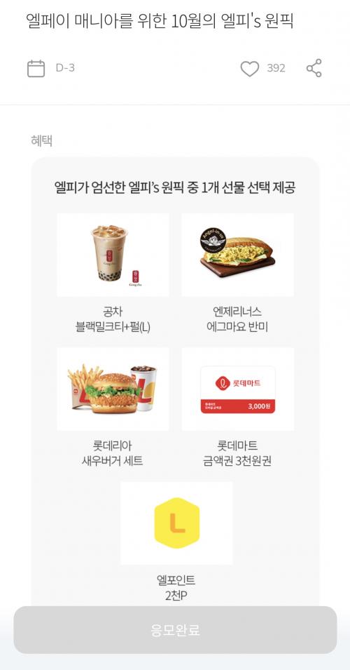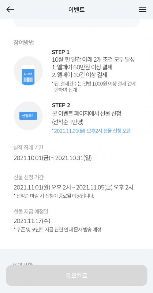 10월 한달동안 엘페이로 10건이상결제 + 50만원 이상결제하셨다면 응모가능합니다.