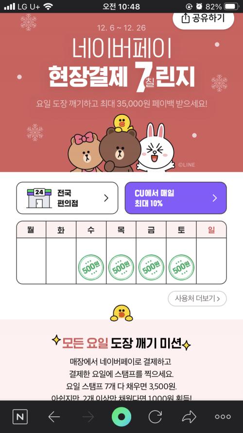 요일별로 현장결제 500원 이상 참여하면 500포인트를 돌려주는 이벤트인데.. 별로 생각이 없었다가 얼떨결에 시작했네요 ㅎㅎ