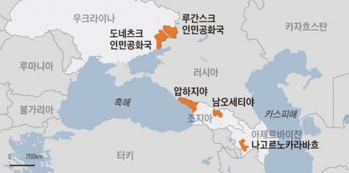 국제사회에선 승인받지 못한 독립국들 입니다. 러시아가 우크라이나 국경까지 군사 포진시켰다가