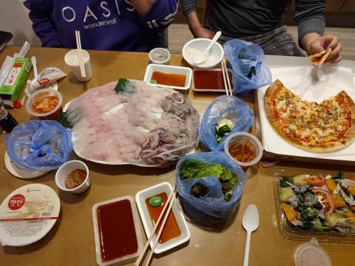 마지막만찬을 동명항가서 회떠서 석식으로 가져온 피자랑 아주 맛있게 배터지게 먹고 배불리 잤습니다..^^