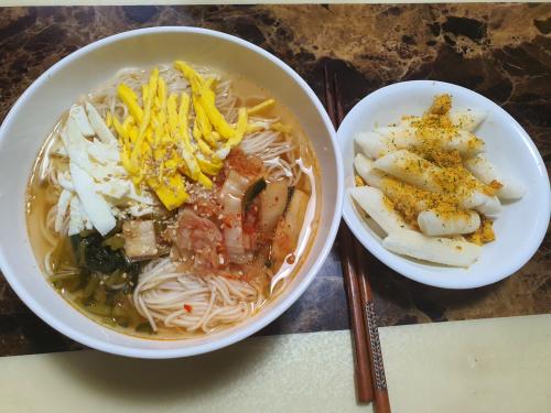 어제 육수 만들어둔게 있어서 달걀지단 부치고 김치무쳐서 고명으로 올려서 주네요..떡도 튀겨주니 잘먹네요..