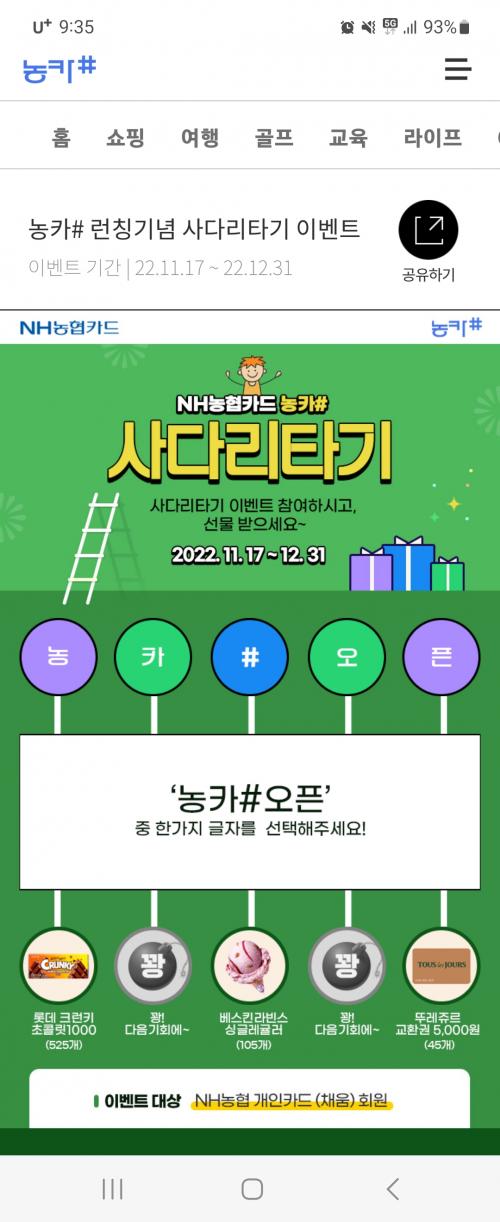 당첨상품이 너무 소소한데 하루에 한번 도전해보셔요ㅎ 17일부터 매일하고있는데 계속 꽝이에요ㅜㅜ (이건 농협개인카드 있어야된대요!)
