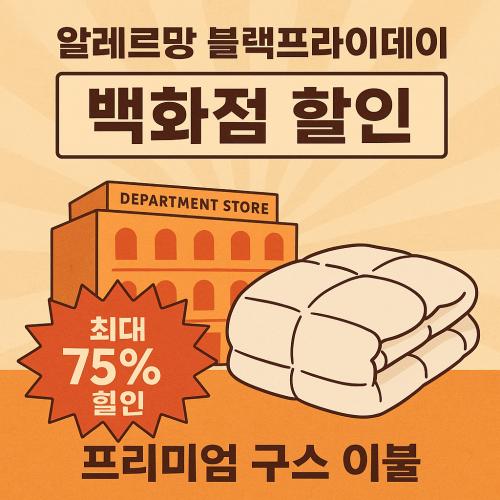 알레르망이 2025 블랙프라이데이를 맞아 전국 주요 백화점에서 프리미엄 구스 이불을 최대 75% 할인 판매합니다.