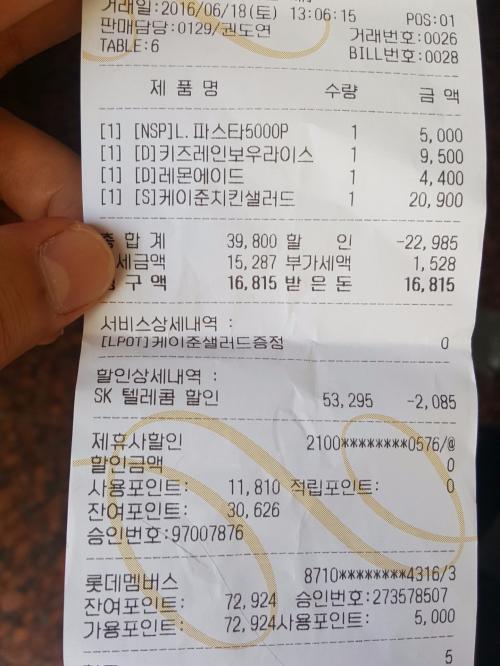 케이준치킨샐러드는 주문시 미리 말해야된다며 캐쉬백 추가할인은 안된대서 t멤버쉽할인하고 캐쉬백포인트로 계산했더니 미리줌5000포인트포함해서