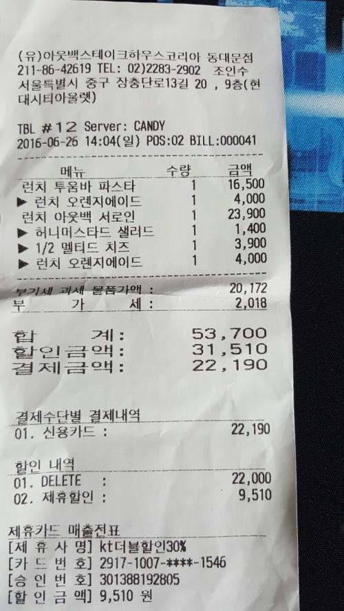 역시 아웃백은 할인을 많이 받아야 제맛입니다 ㅎㅎ