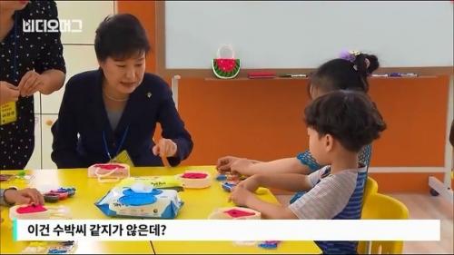 어안이 방벙해지는 박 대통령의 발언은 계속 이어졌다. 그는 이번에는 수박 가방에 씨를 붙이고 있는 어린이에게 다가가 "이건 수박씨 같지가 않은데?" 라고 말하며 다시 한번 현장을 얼어붙게 만들어 버렸다.