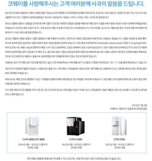 갑자기 코웨이가 실검 순위에 올라서 확인해 보니 이런 사과문이 떴네요
