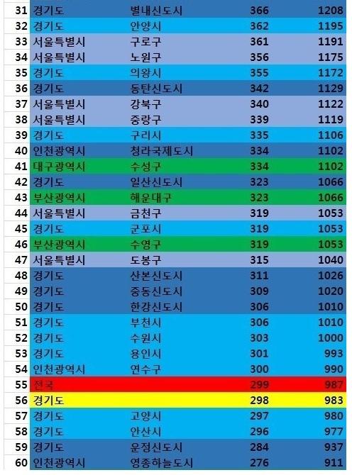 60위 안에 지방이 3개 밖에 없네요. 딘짜 수도권 집중화 너무 심각한듯. 지방 저 3군데도 서울 부자들이 집값 띄워놔서 저런거죠. | ||
