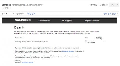 US samsung 갤탭 S2 와이파이 백오더 메일 또 왔네요 > 자유게시판