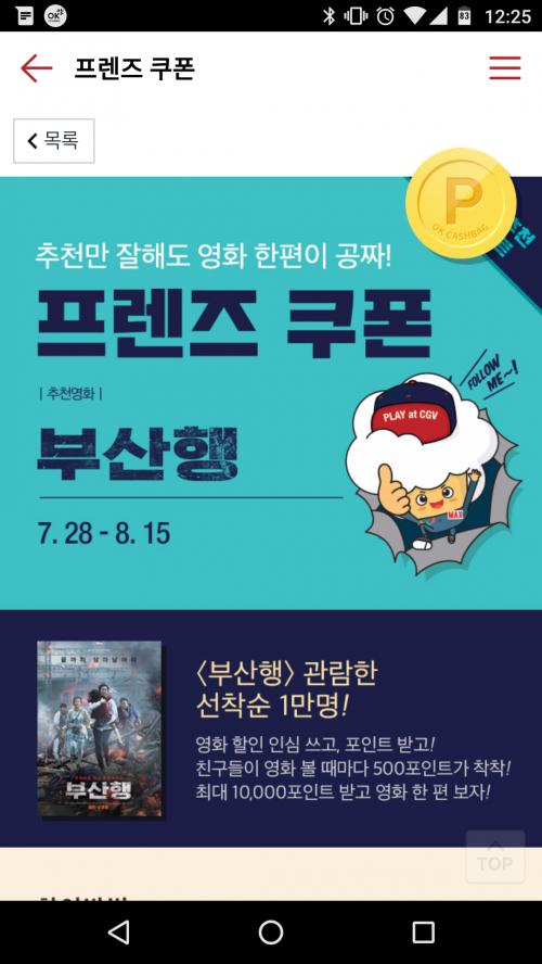 CGV 이벤트 뒤적뒤적 하다가 보니 부산행 영화 본 사람들은 7천원짜리 쿠폰 친구들한테 줄수 있더라구요.