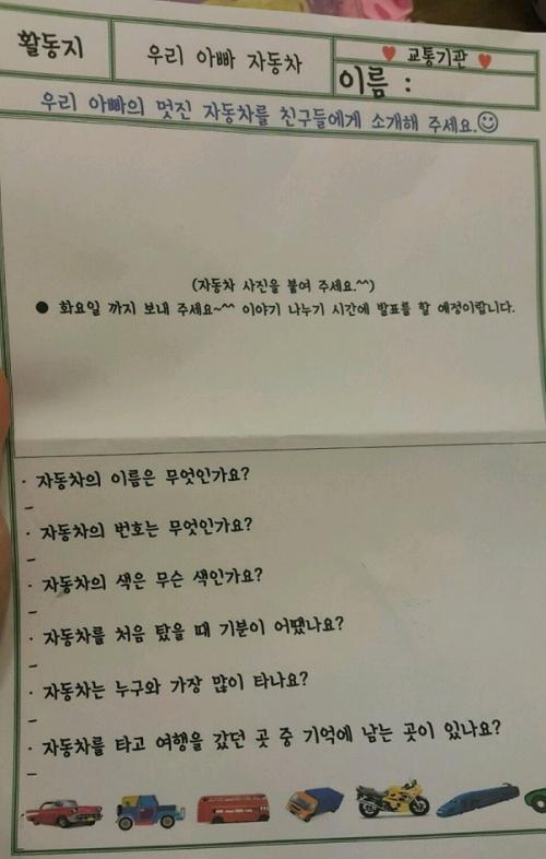 저 숙제를 하면서 부모님한테 애가 "아빠 유치원에서 아빠 차 사진 찍어오래~" 이런 소릴 들었을 때 부모님은 어떻게 생각하실지... | ||