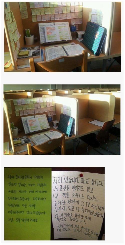민폐죠 .. . 대학교 독서실에 자리 예약도 안하고 저렇게 한자리 차지하다, 신고받고 쫓겨나니 욕하면서 짐정리 하던 분이 생각나네요 | ||