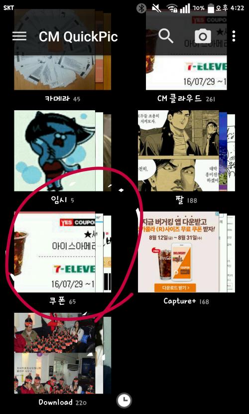 깔아서 쿠폰 폴더를 만든 후 거기에 몰아 넣어두는데 문자로 온 것 따로 다운 안받고 캡쳐해서 이동합니다