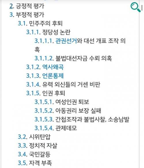 [2] 현재 평가 문서가 있는 역대 대통령 문서를 통틀어 긍정적 평가 문단에 내용이 전혀 존재하지 않는 유일한 대통령이다. 몇십년째 씹히는 전두환도 긍정적 평가가 있는데.. 다만 하위 평가 문서들에서 긍정적 평가를 찾아볼 수 있기는 하다. 물론 긍정/부정 및 장/단점은 상대적 개념이며, 공존하는 개념이므로 긍정적 평가의 여지가 아예 없을 수는 없다. 즉, 판단은 독자의 몫.