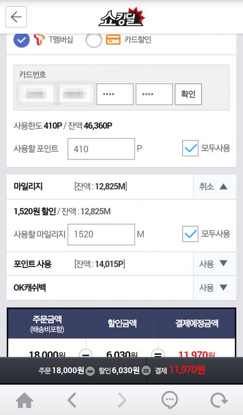 그런데 수동으로 쇼킹딜 및 11번가 앱에서 결제 진행할 때의 가격과 다르다는 것이죠