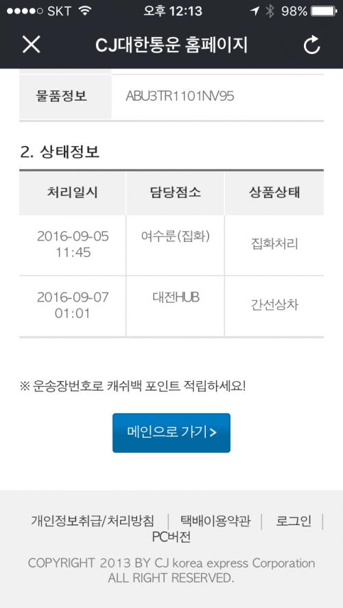 지점에서 접수만하고 물량이 많아서 허브로는 그다음날 보낸거 같습니다ㅠ | ||