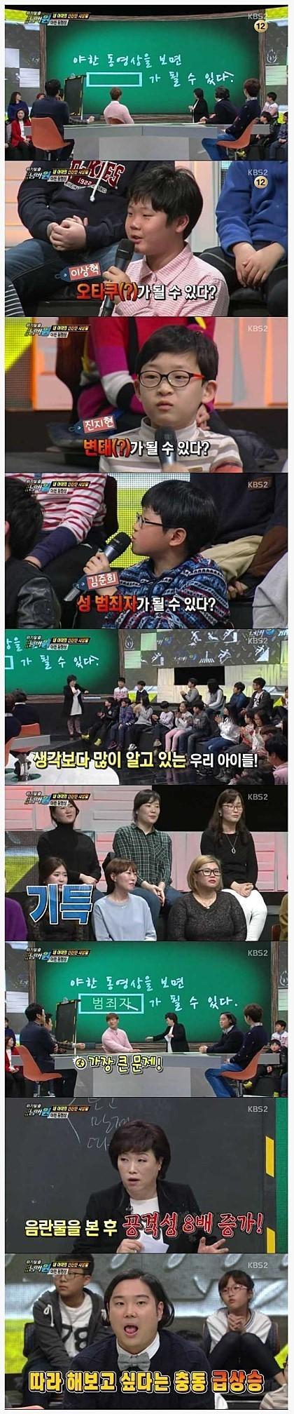 다만 저 방송이 '초등학생'들에게 끼칠수 있는 영향을 말하는것이었고 그래서 방청객도 초등학생과 그 어머님과 같이 방송 하는것이었죠