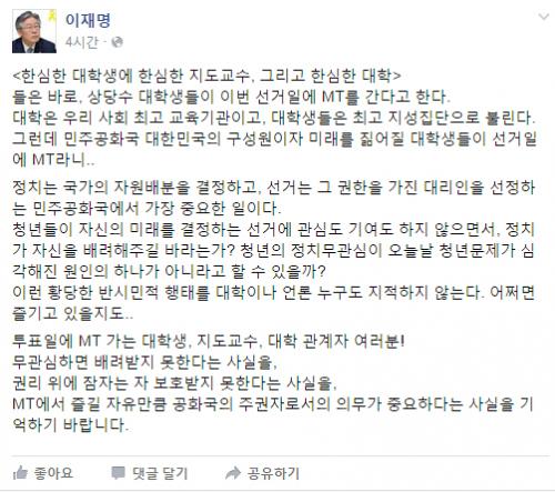 "들은 바로, 상당수 대학생들이 이번 선거일에 MT를 간다고 한다. 대학은 우리 사회 최고 교육기관이고, 대학생들은 최고 지성집단으로 불린다. 그런데 민주공화국 대한민국의 구성원이자 미래를 짊어질 대학생들이 선거일에 MT라니..."