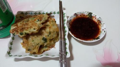 명절이 코앞인만크 전느낌의 음식먹고싶어서 냉동실에 쟁여둔 비비고왕교자만두 전자렌지몇분돌려서 찐거 숫가락으로 으깨고 물,부침가루조금 계란2개 풀어서 부쳐봤네요