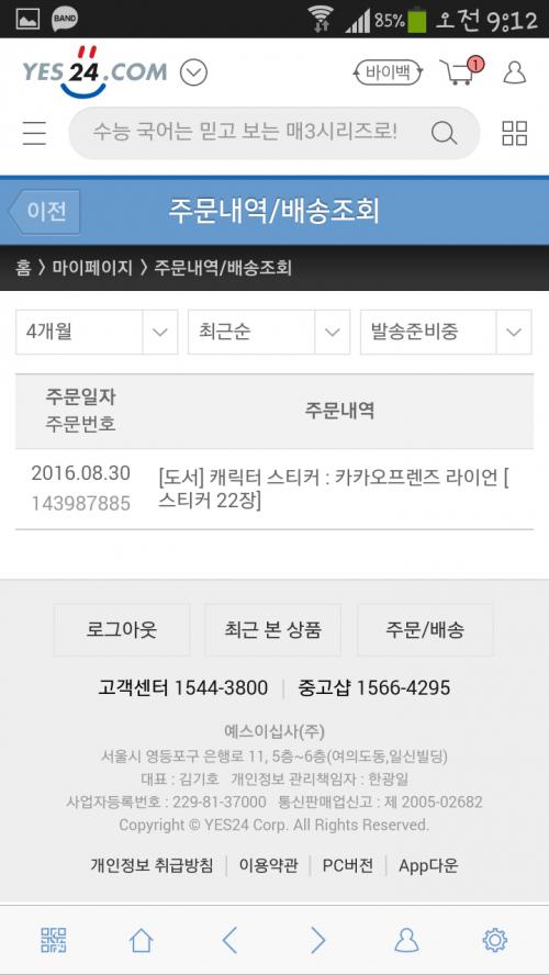 이건어때에서 카카오 3종 스티커북보고 라이언만 8월말에 cj몰에서 신청했는데 취소당하고 예스24에서 이번에는 친구도 줄라고 두권 신청했는데 함흥차사네요