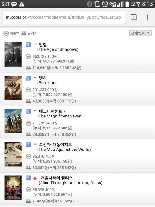 흠.. 밀정 천만 넘긴 힘들거라 예상은 했는데, 고산자도 글코 추석 파워효과를 못본거 같네요.