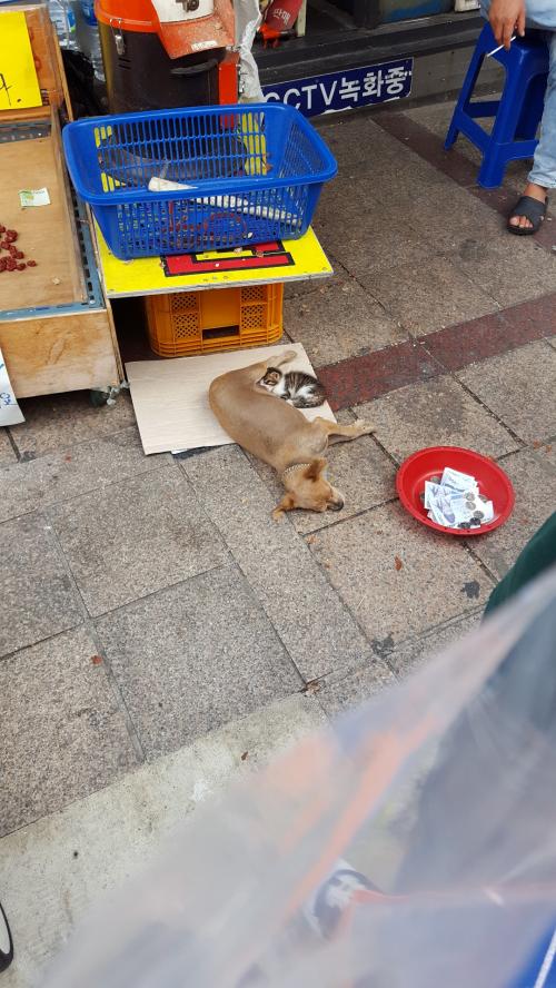 좀전에 지나가다 봤는데 새끼는 안보이고 큰고양이 밥먹고 있네요 강아지랑 돈통은 사진대로 있구요 관심주는 사람 거의없고 고양이 먹이는거봐선 학대하는 분위기는 아닌것같은데 돈통이 거슬리는건 사실 | ||