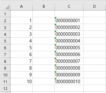 C열 셀서식에서 사용자지정으로 형식을 하신다음 오른편 형식란에 0000000000 (0이 열개)를 넣으시면 됩니다. | ||