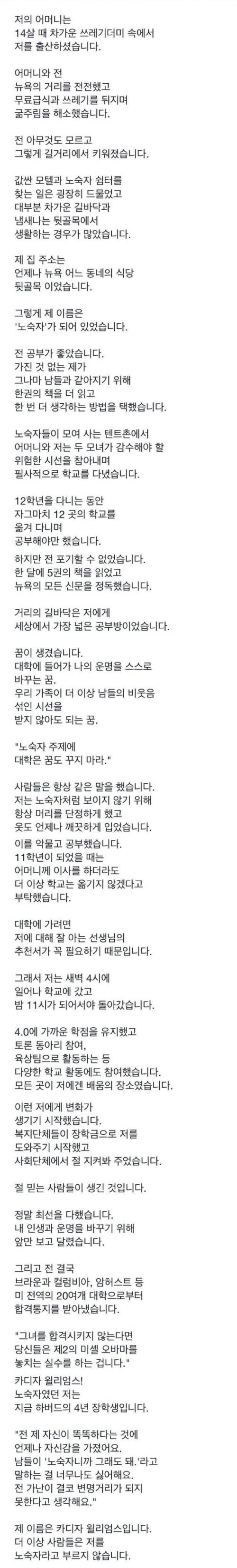노숙자가 하버드 장학생 대단하죠 우리도 노가다하다 서울대 갔다고 공부가 제일 쉬웠다는 베스트셀러가 나오니까요