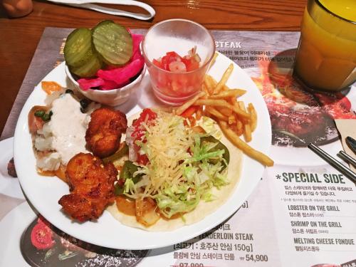 차이니즈 볶음면 / 포크 립 / 연어 타코 / 프렌치프라이즈 / 감귤 주스