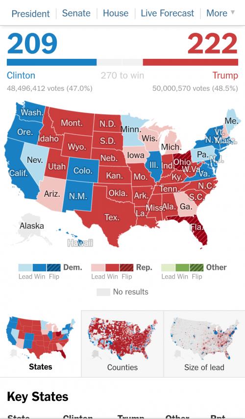 펜실베니아(선거인단 20)까지 넘어갔어요. 힐러리 끝났습니다. | ||