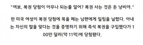 이거 남편이 추첨식 복권 사오라고 시켰는데, 아내가 빡쳐서 추첨식말고 즉석복권 사다 줬는데 당첨됐다고... ㄷㄷㄷ | ||